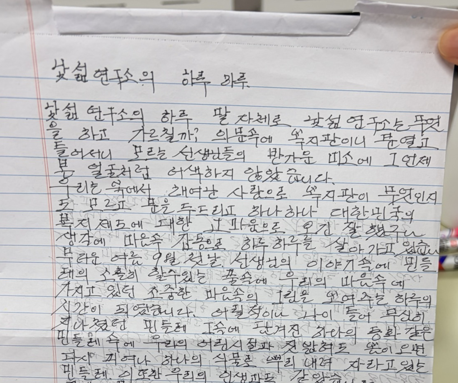 : 금○ 주민분은 복지관의 ‘낯섦 연구소’ 활동에 참여하며 직접 글을 쓰고 책을 집필하신 분이었습니다. 그 초안을 실습생인 저희에게 기념 선물이라며 서슴없이 건네주셨습니다. 복지관으로 돌아와 다시 글을 읽어보니, 금○ 주민분이 하셨던 말씀과 마음이 글 속에서도 고스란히 느껴졌습니다. 진심을 다해 써 내려간 글이라는 것이 느껴졌습니다.