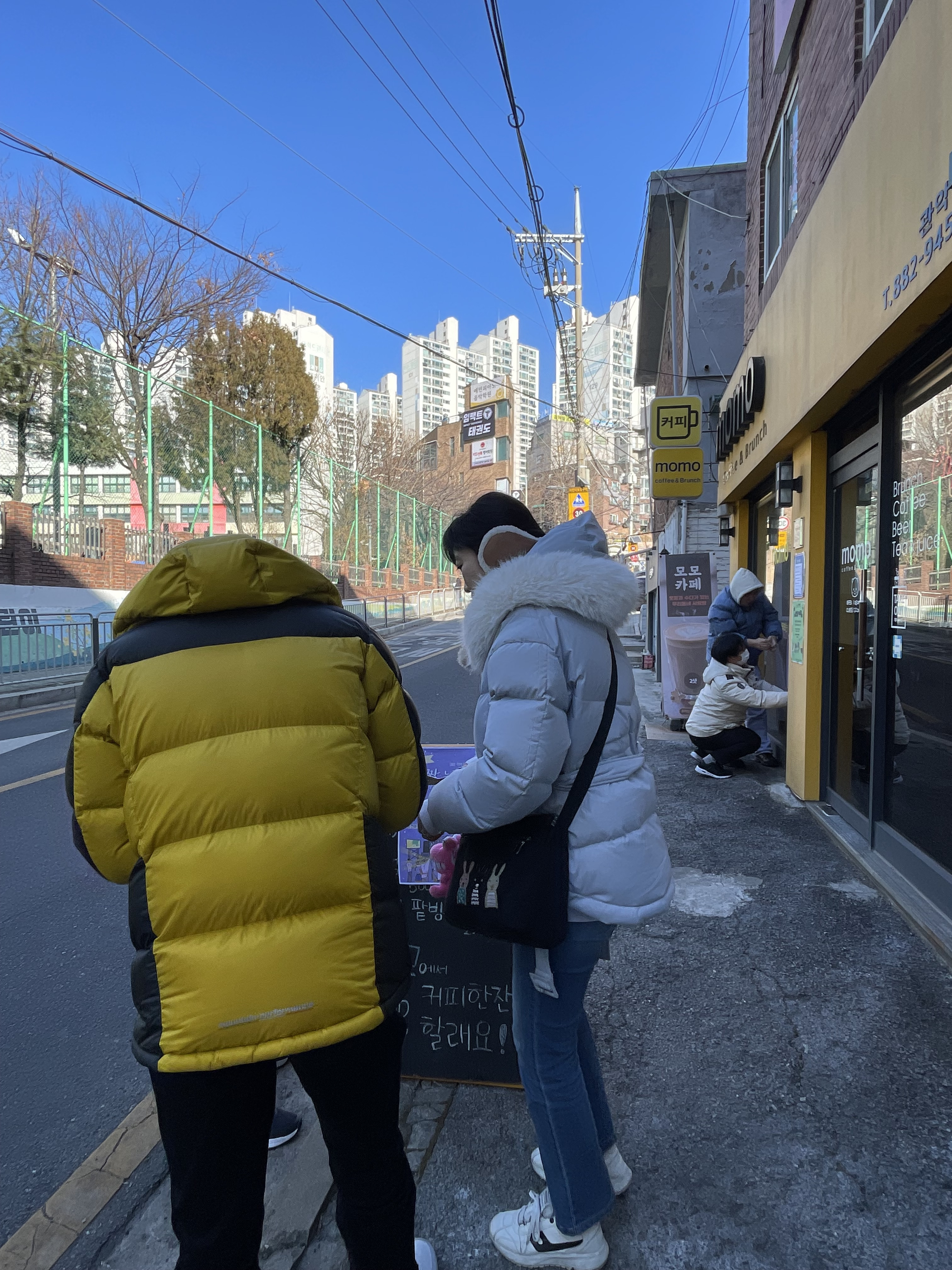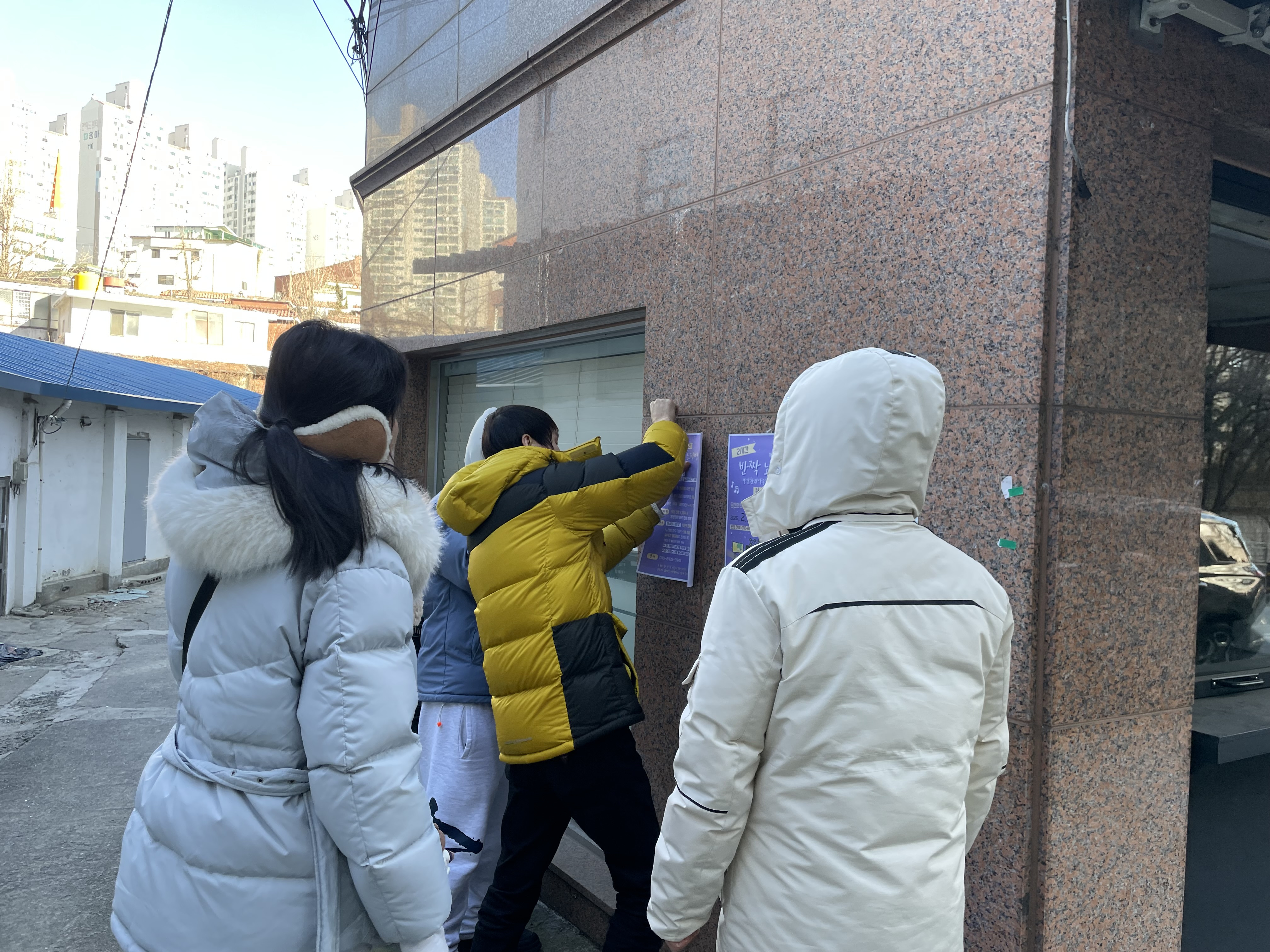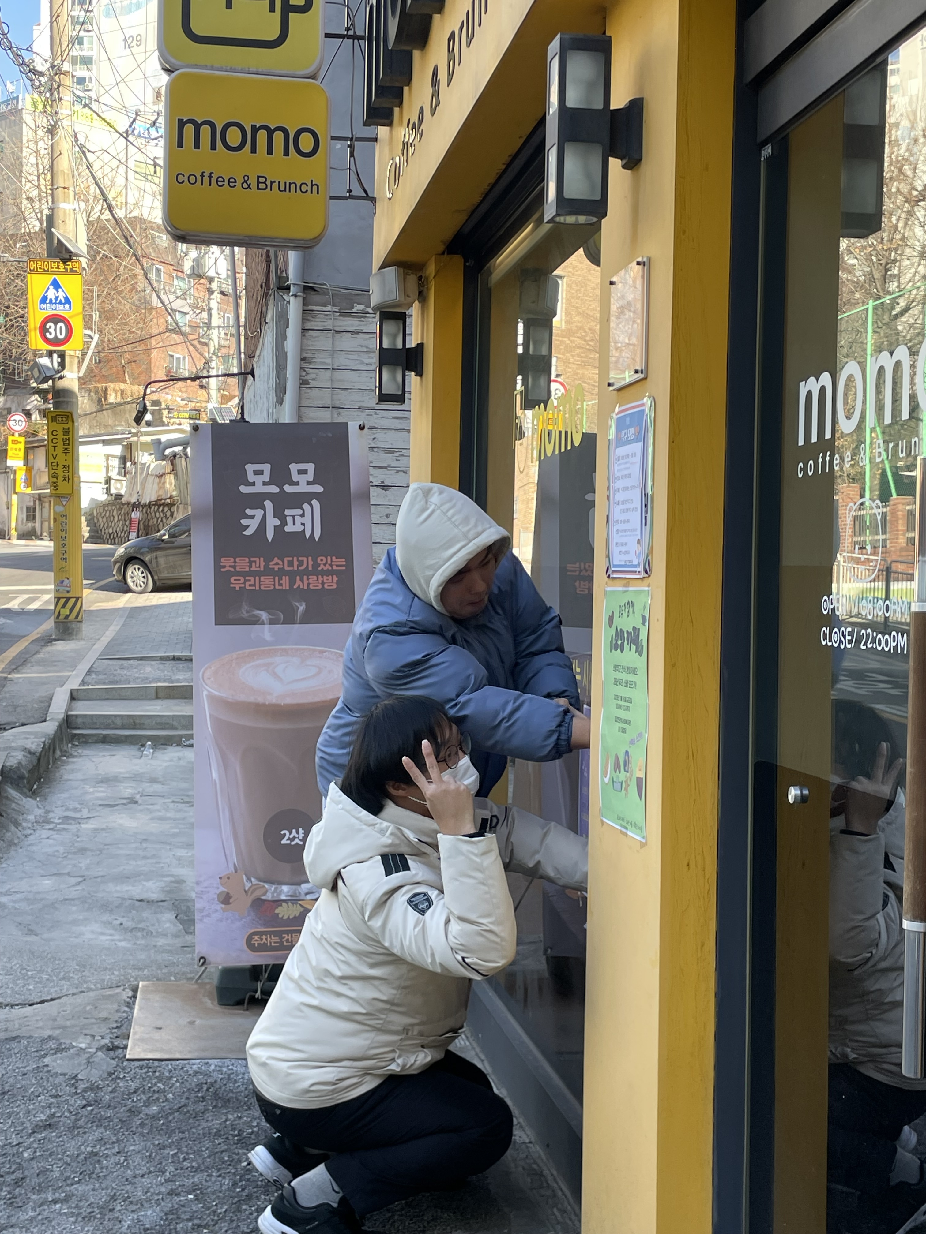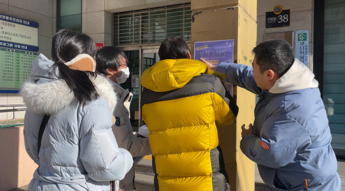 밖으로 나가자 분위기는 더 활기차졌습니다. 모두가 앞장서서 포스터 위치를 잡고 “여기가 좋겠다!”, “저기도 붙이자!” 하며 신이 났습니다. 심지어 장○님은 온라인 카페에도 공지글을 올릴 수 있다며 홍보가 필요한지 여러 번 묻기도 하셨습니다. 사실 은○쌤과 둘이 계획했던 포스터 부착 위치와는 많이 달라졌습니다. 생각했었던 모모카페말고도 동주민센터 앞과 동네 골목까지 자연스럽게 확장되었습니다.