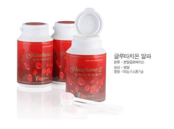 1) 제품명 : ‘글루타치온(Glutathione) 알파(α)’, (150g x 1병)(분말형). 2개월분 / 1회 1스푼(1g), 1일 2회 복용 / 제조: 현바이오텍