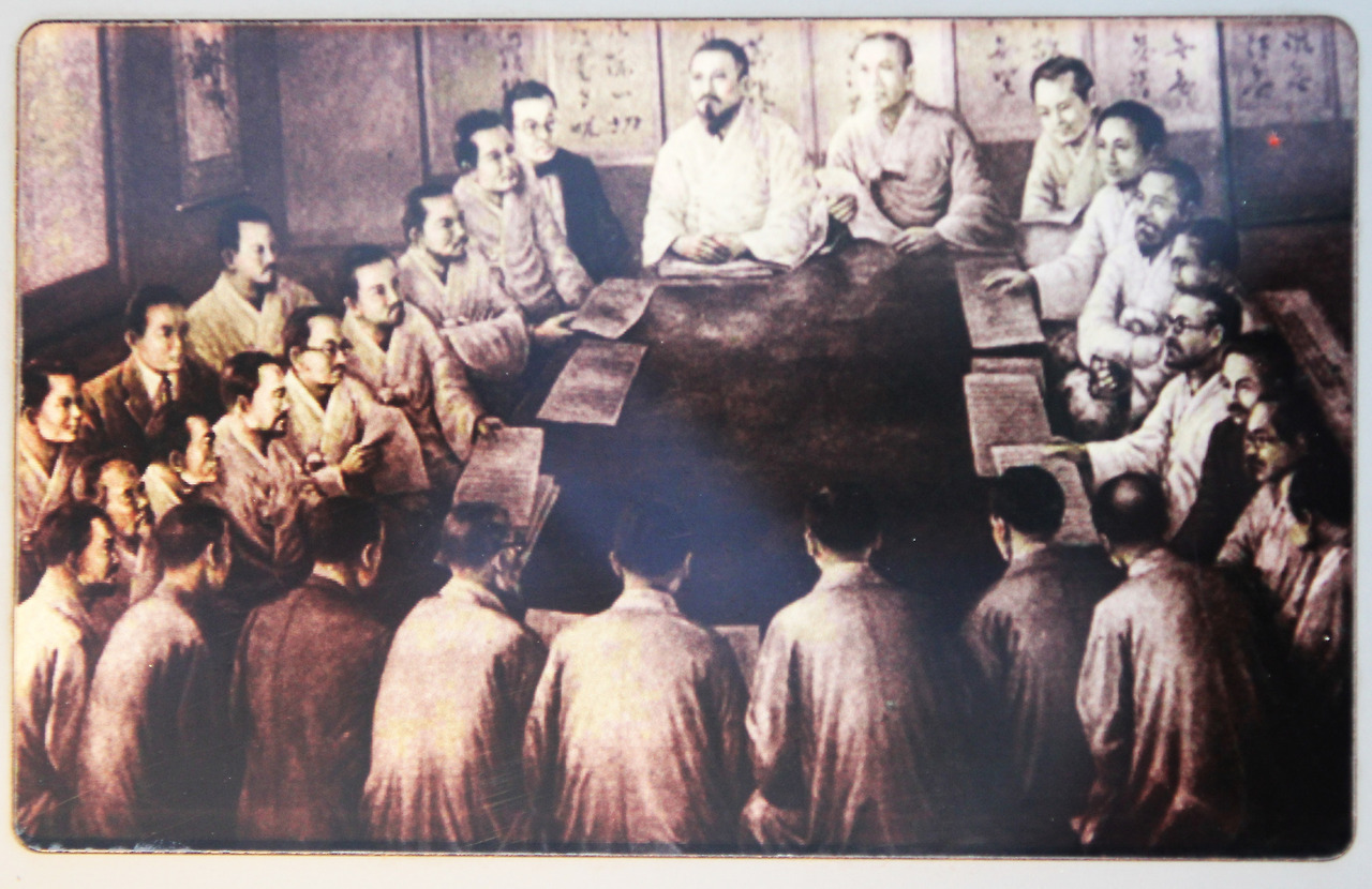 . 태화관에서 기미독립선언서를 낭독하고자 모인 민족대표들의 모습을 그린 기록화. 본래 33인이 왔어야 하나