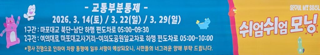 | 도보 코스 개요 | 여의도공원 문화의마당 <-> 여의대로 <- > 차없는 마포대교 (반환) 여의도 맛집에서 조식 - 여의공원 - 국회의사당역 (약9Km. 하하) 현지상황에 따라 진행자가 도보 코스를 적절히 변경/가감할 수 있습니다. |