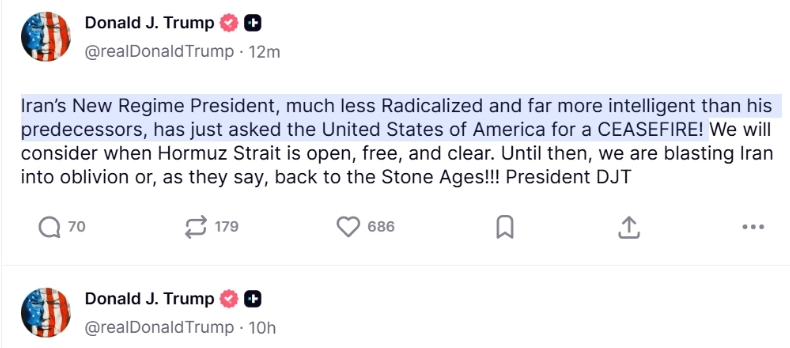 - 휴전 요청 수신: 이란 측에서 미국에 휴전(CEASEFIRE)을 요청했다고 밝혔습니다.