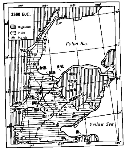 산동반도 太山 주위의 고지대만 남고 나머지는 수심 몇 미터내로 침하되었다는 이론들..