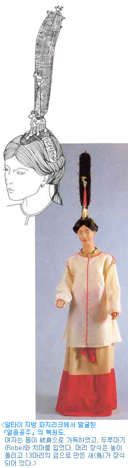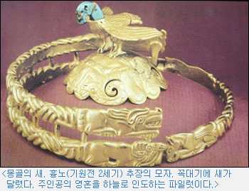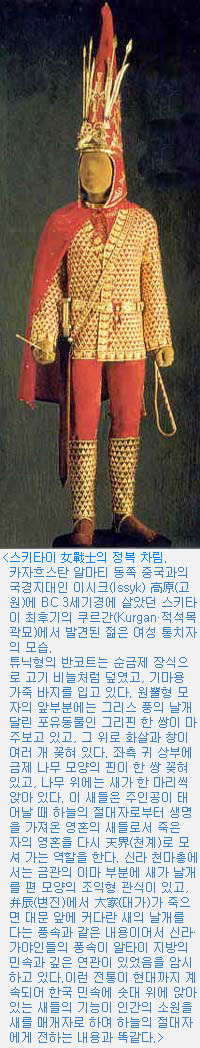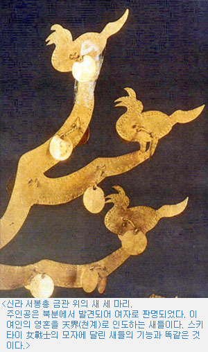 알타이 고분에서 미라로 발견된 동양계 여인의 盛裝한 모습에서 올린 머리에 장식된 순금제 새들이 있다. 이 새들도 주인공의 탄생과 죽음에 깊이 관여하였던 영혼의 새들로서 여주인공의 혼을 天上의 세계로 인도하는 역할이다. 신라의 천마총에서 발견된 금관의 이마 부분에 커다란 새의 날개 한 쌍(鳥翼形 裝飾)이 달려 있는 것과 똑같은 고대인의 영혼관이다.