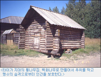 사냥꾼들은 통나무집에 산다. 우선 혹한을 이겨 내려면 보온이 잘되어야 하기 때문이다. 또 한 가지 이유는 통나무집은 견고하기 때문이다. 한번 내리면 몇 미터씩 오는 폭설의 무게를 이기려면 우선 집이 튼튼해야 한다. 또한 여기 주민들이 시베리아 삼림지대의 맹주들인 호랑이나 곰 같은 맹수의 습격으로부터 살아남으려면 통나무집밖에는 달리 선택의 여지가 없다.