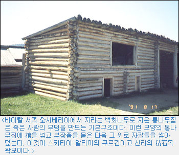 「타이가 하우스」(멋대로 命名한다면)의 기본형은 유목민인 스키타이-알타이族들의 무덤방으로 전용되었다. 예니세이 상류의 유명한 파지리크 古墳(고분)은 초기 금속기 시대의 族長級(족장급) 주인공이 통나무집을, 저승생활을 위한 집으로 삼아 쉬고 있었다. 수많은 副葬品(부장품)들이 통나무집 속에서 발견되었다. 주인공과 유품들이 도굴되지 않도록 통나무집 위에 천문학적 분량의 돌이 산처럼 쌓여 있는 구조였다.