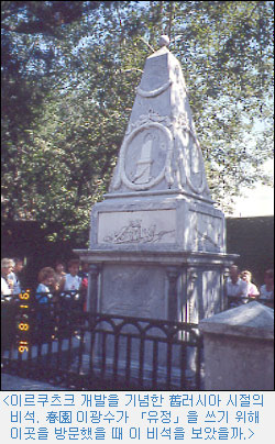 순이가 알 턱이 없었다. 하긴 러시아말로 알면 무슨 의미가 있겠나. 원주민인 브리야트族이나 인근에 살고 있는 에벵키族의 말이어야 우리말과 비교해 볼 수 있었을 것이다. 당목이 있는 곳에 장승이 있는 법이다. 호텔 입구에 텁석부리 영감 모습의 장승이 있었다. 만든 지 얼마 안 된 듯한, 安東 하회탈을 쓴 모습의 장승이었다. 먹과 붓이 있었다면 「天下大將軍」이라고 써 주고 싶었다.