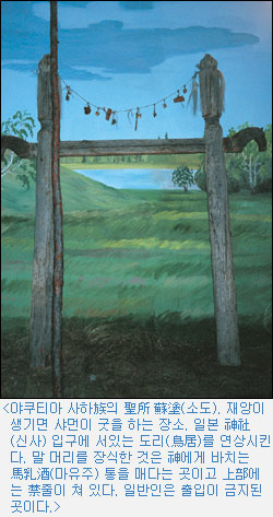 바이칼湖 서쪽 언덕 위는 나무 숲이었고, 숲 속엔 굵은 백화나무에 흰색 광목 조각이 무수하게 매여 있었다. 우리나라 巫俗(무속)에도 등장하는 堂木(당목)이었다. 한국에서는 당목에 五方色(5방색)인 검은색(북) 붉은색(남) 푸른색(동) 흰색(서) 황색(중앙)의 천을 매단다. 한국 것과 비교하면 바이칼 것은 흰색 한 가지뿐이어서 단순하지만, 나무에다 헝겊이나 종이를 매달면서 인간의 소원을 비는 신앙의 내용은 똑같은 것이다.