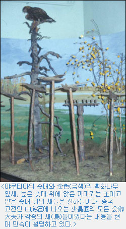 나의 알타이에 대한 관심은 박시인 교수가 소개한 알타이 신화 때문이었다. 朴교수는 알타이 지역을 답사해 보지 못한 채 2차 자료만 가지고 알타이 문화를 소개하였지만, 그 내용에는 한국학을 연구하는 사람들이 꼭 알아야만 하는 것들이 수두룩하였다. 이를테면 영특한 새로서 까마귀의 기능이라든지, 씨족의 조상이나 최초의 왕이 등장하는 장소가 「신령스러운 나무(神樹)」 밑이라는 것 같은 내용은 고구려 고분벽화의 三足烏(삼족오)나, 鷄林(계림:경주)에서 발견되는 김알지 설화 같은 것이었다. 그런 내용을 읽어 가면서 나는 큰 충격을 받았다.