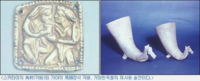 그러고 보니 신라 유물 중에 동물 뿔 모양의 술잔인 角盃(각배)도 그리스, 스키타이, 알타이 지역에서 고루 발견되고 경주에서 발견된 기와에 그려진 날개 달린 天馬(천마)는 그리스 신화에 등장하는 페가수스(pegasus)라고 해석해야 될 판이다. 그렇다면 신라인과 그리스인은 비록 時空을 달리하였지만 스키타이-알타이를 통한 말의 문화로 단단히 연결되었던 것 같다.