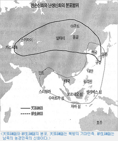 아시아에서 天孫神話는 기마민족들인 몽골 알타이 스키타이族들의 신화이고 卵生신화는 농경민족들인 대만의 빠이완族, 인도네시아의 자바族, 태국의 타이族, 인도의 문다族의 난생신화와 공통점이 있다. 이런 현상을 지도로 보면 천손신화는 한국보다 북쪽에 살던 기마민족들의 사유세계이고, 난생신화는 南아시아의 열대와 아열대에 사는 사람들의 사유세계이다.