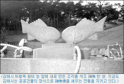 그래서 나는 모든 의문의 원인 제공자인 김수로왕과 허황옥 할머니의 능을 참배하러 김해까지 가지 않을 수 없었다. 그때 내가 맞닥뜨린 것이 수로왕릉의 대문에 새겨 있는 神魚像(신어상)이었다.