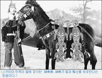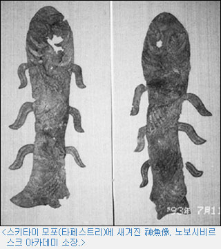 그런데 물고기가 인류를 구해 준다는 이야기는 지구상 여러 민족의 민속에서 발견된다. 예컨대 몽골 사람들도 물고기를 신성시하여 먹지 않는 풍속이 있는 것을 본 적이 있다. 기마민족으로 중앙아시아에서 맹주 노릇을 하던 스키타이族들도 말의 장식으로 물고기 한 쌍을 달고 다녔다는 연구보고서가 있다.
