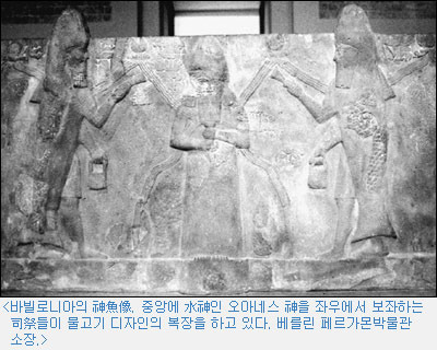 그 神魚像이 새겨 있는 수조는 바빌로니아에서 가져온 것이었다. 바빌로니아의 왕이었던 센나게립王이 세운 궁전 중앙에 있던 신앙용 聖水를 담는 거대한 물통이었다. 여러 조각으로 부서진 것을 복원한 것이었지만 조각은 선명하였다.