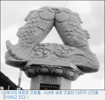 <수로왕릉 정문(納陵)에 새겨진 神魚像. 가락국 시절의 國章이다.>