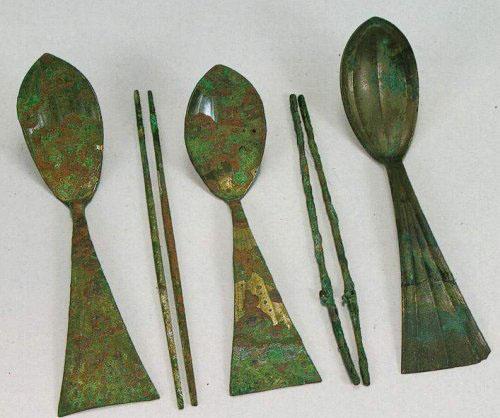 (Evidence of the use of chopsticks is found as far back as the ancient Shang Dynasty (1766-1122 BC). A pair of bronze chopsticks were excavated from Tin Ruin's Tomb 1005, at Houjiazhuang, dating back to approximately 1200 BC. )