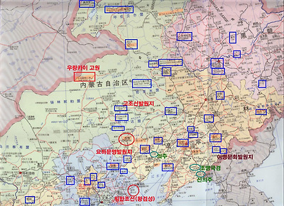 빨간원은 바로 대륙최고문명의 발생지이며 후예 고조선의 본거지이며 漢나라가 마지막으로 보았던 위만조선이 있었다던 천진 하구 창려의 위만조선 ,고구려,부여의 주요무대는 파란 사각형선으로 .녹색 사각선은 조선말까지 유지했던 조선의 舊 영토지역이다.(운영자 연구결과 위만은 山西省 濟源 근방으로 피신)