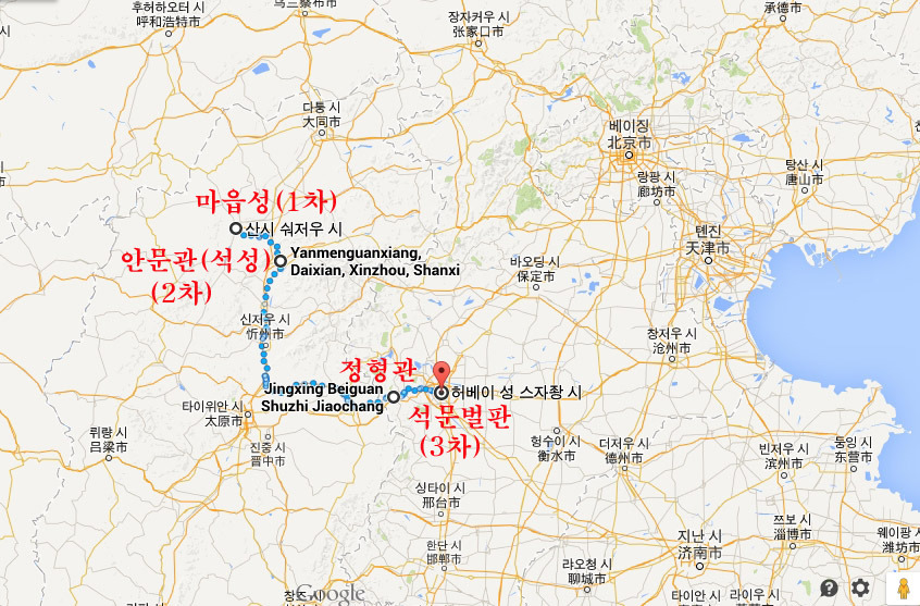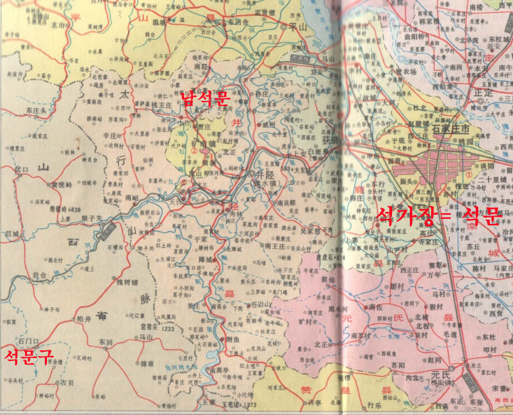 현재 하북성 찬황의 북쪽에 있는 석문(현 석가장)의 위치지도이다.