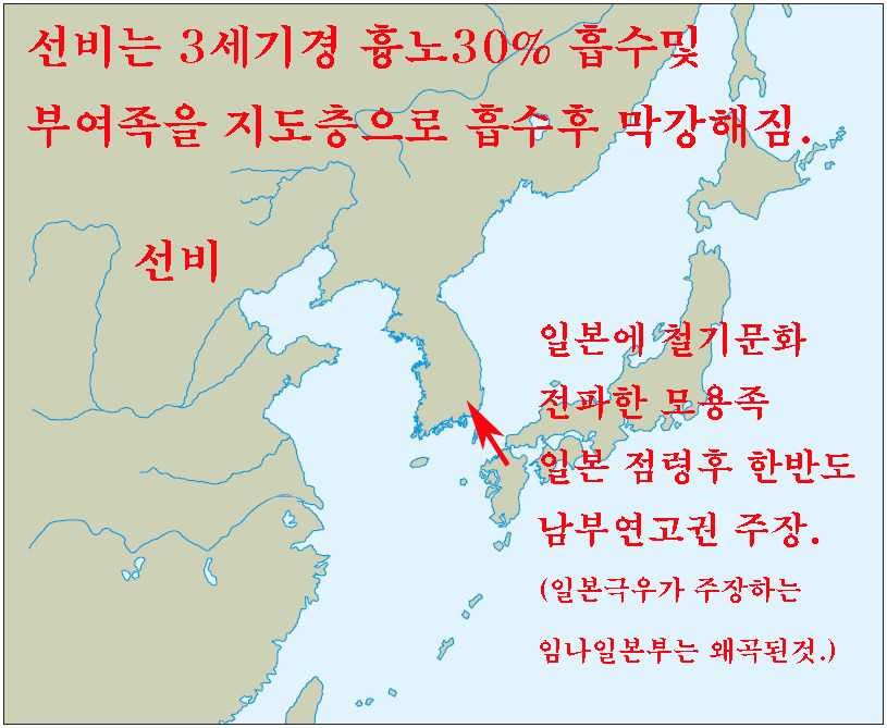 기마민족도래설의 주창자 일본학자 江上波夫의 <기마민족설>이나 코벨의 <부여 일본 도래설>등을 참고할 필요가 있다. 일본학자의 논문들이 오히려 냉정하고 합리적인 요소들이 많아보인다. 특히 우리나라 학계에서는 <임나일본부설>하면 핏대부터 올리고 보는데 그것보다는 한,중,일사서를 비교하여 당시 日本의 주체가 누구냐를 먼저 파악하는 것이 중요하다. 즉 한반도에서 신라,가야를 세우고 열도로 넘어가 철기문화를 전달한 주체가 선비족이였던 것이다. 당시 선비족은 부여족의 遺習이 강하게 남아있었다.