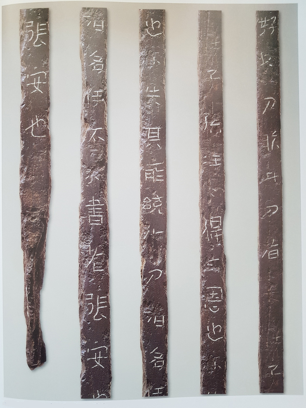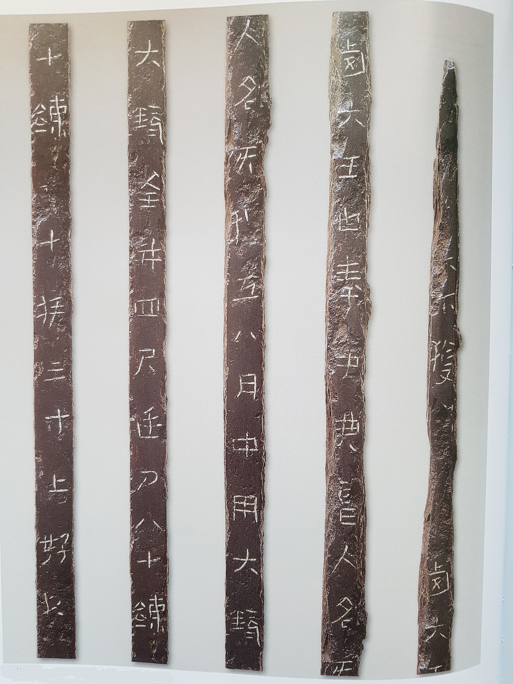 台(=治)天下獲□□□鹵大王也,奉事典曹人名无□(利ヵ)弖(=互),八月中,用大鉄釜并四尺廷刀,八十練,□(九ヵ)十振,三寸上好□(利ヵ)刀,服此刀者,長寿,子孫洋々,得三恩也,不失其所統,作刀者名伊太□(和),書者張安也. (1873, 큐슈 구마모도현 다마나군 발굴)
