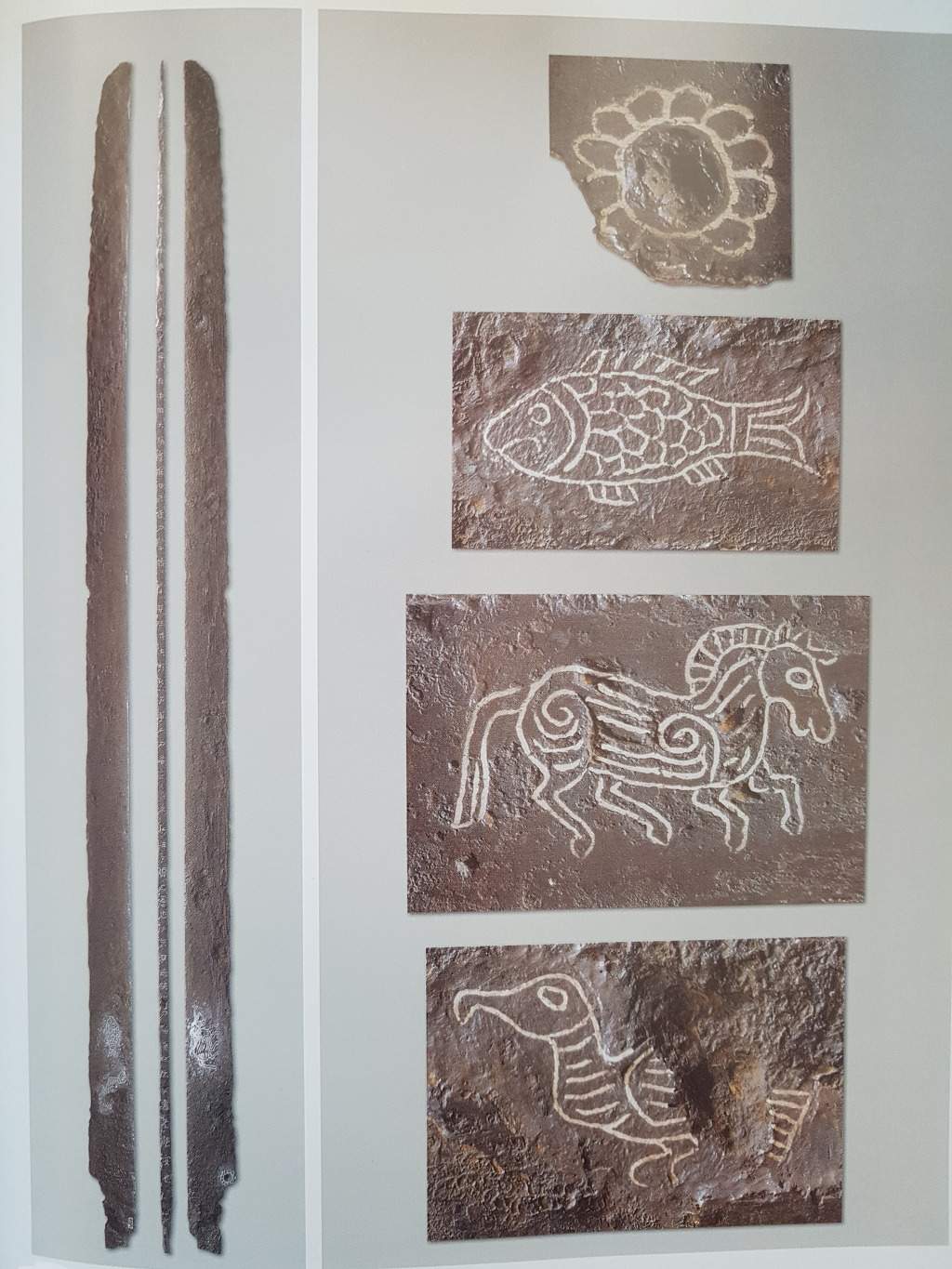 확고이신 개로왕을 모시던 비서 오와케 경호실장이 471년 자신의 역사를 劍 위에 기록으로 남겨 가보로 삼았다. 처음 발굴때는 웅략왕의 것으로 추정하였으나, 1956년 이나리야마 고분(사이타마현)에서 발굴된 검의 명문을 확인한후 확고(獲고)가 개로왕이었음을 확인하게 되었다.