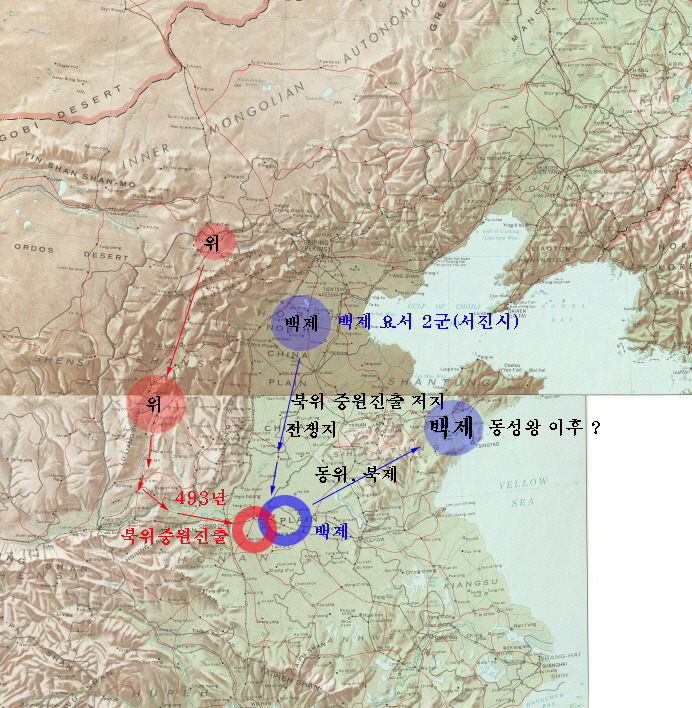 북위는 산서대동에서 태원을 거쳐 493년 중원에 도읍을 정하는데 이때 이미 중원에 있던 백제와 세력의 쟁패를 두고 5차례에 걸친 전쟁을 치루었다고 볼 수있다.