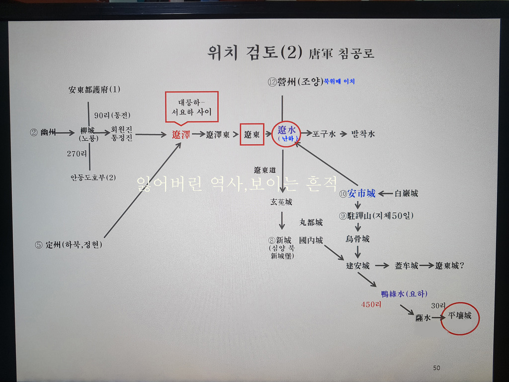 1400년전 평양성에 도달하기까지 당군이 건넌 요하 도하 지점이 지금보다 훨씬 북쪽에 위치하였고 요하를 건너 450리를 동남행하면 평양성에 다다르는 것이 확인된다.