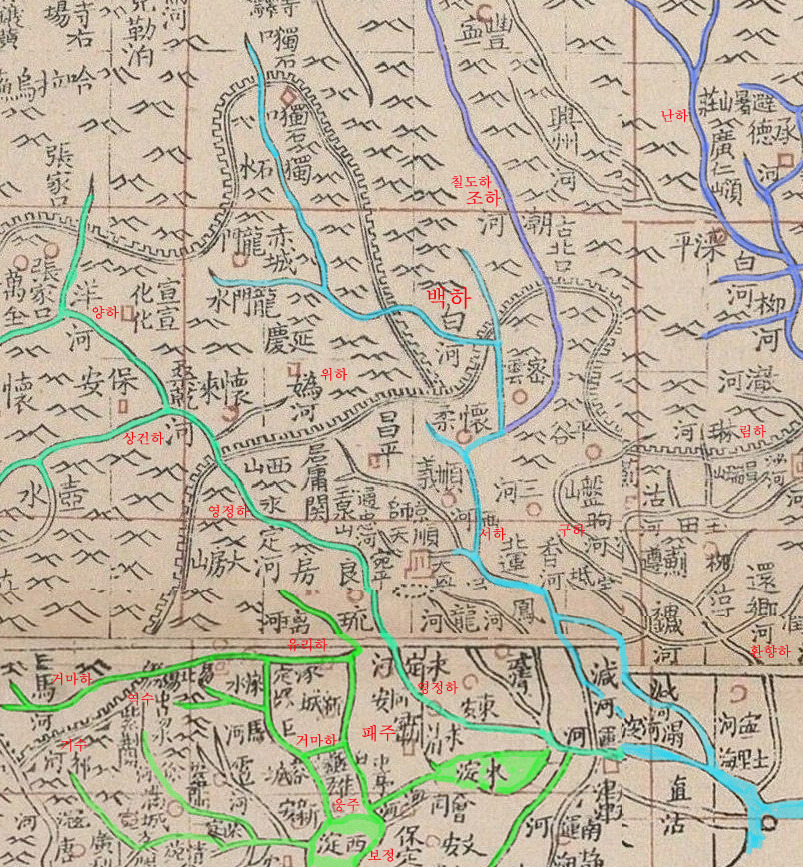하북성 북부 수계 -하늘색선이 백하수계이다.