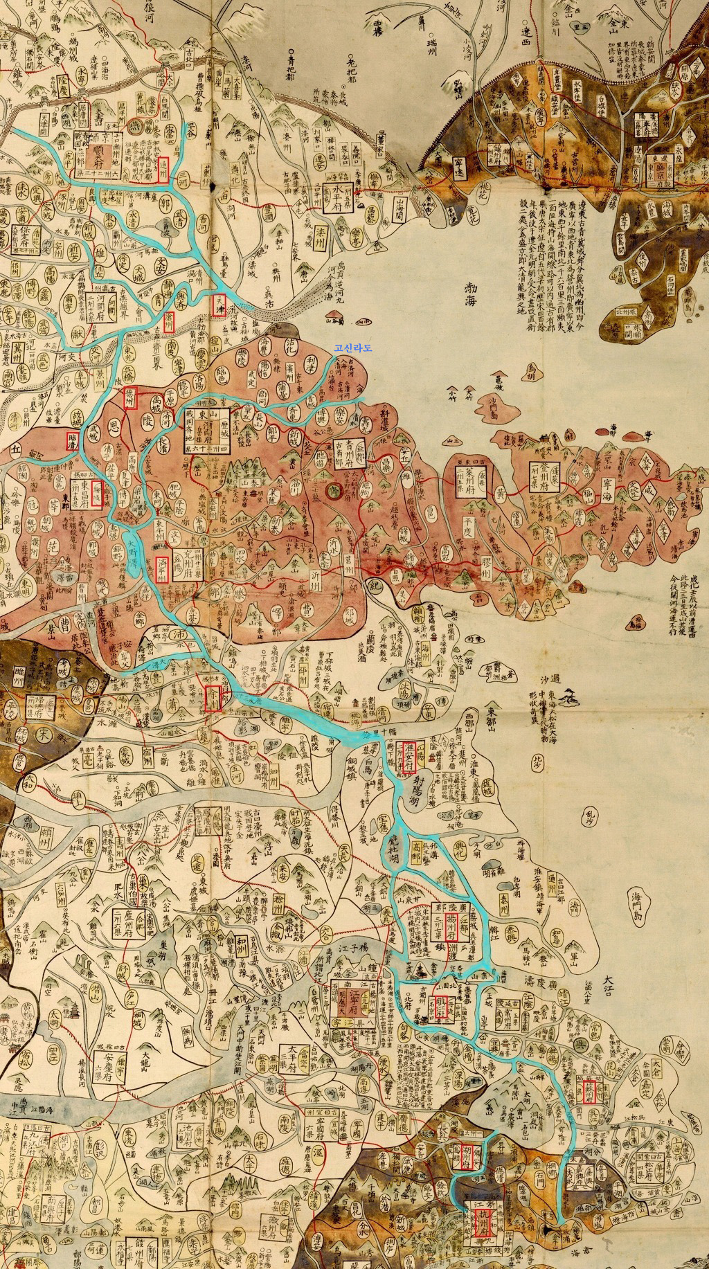 아래는 운영자가 대청광여도를 기본으로 비정하는 양자-황하내륙수로 (푸른수계)인데 고대로 부터 신라-고려시대까지도 운하로 북진하거나 산동大野澤 부근에서 濟河를 타고 대명호를 거쳐 濱州와 利津縣을 통과해 북해(발해)로 들어가 天津과 滄州에 도달하였다. (이루트가 통일신라 가는길)