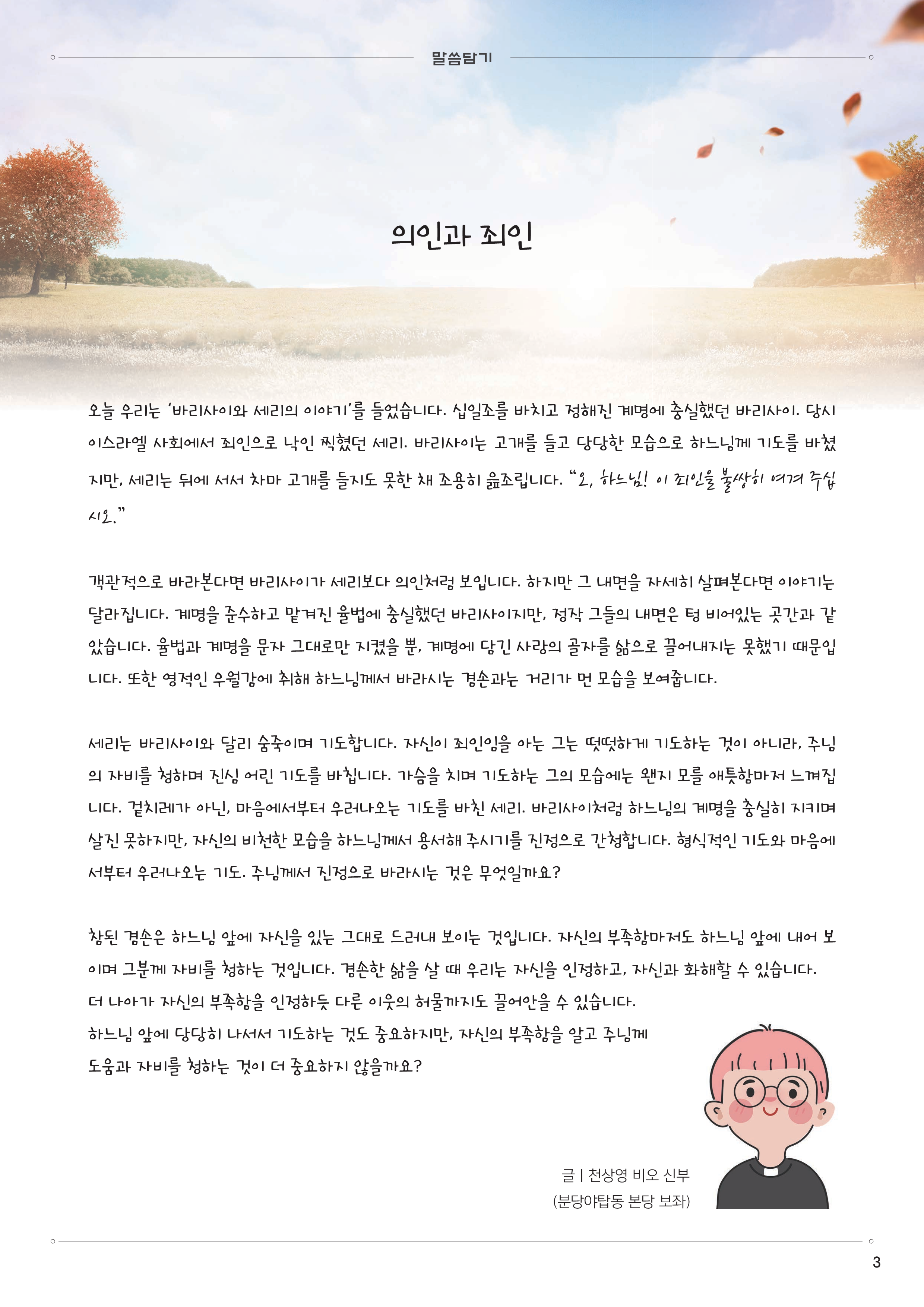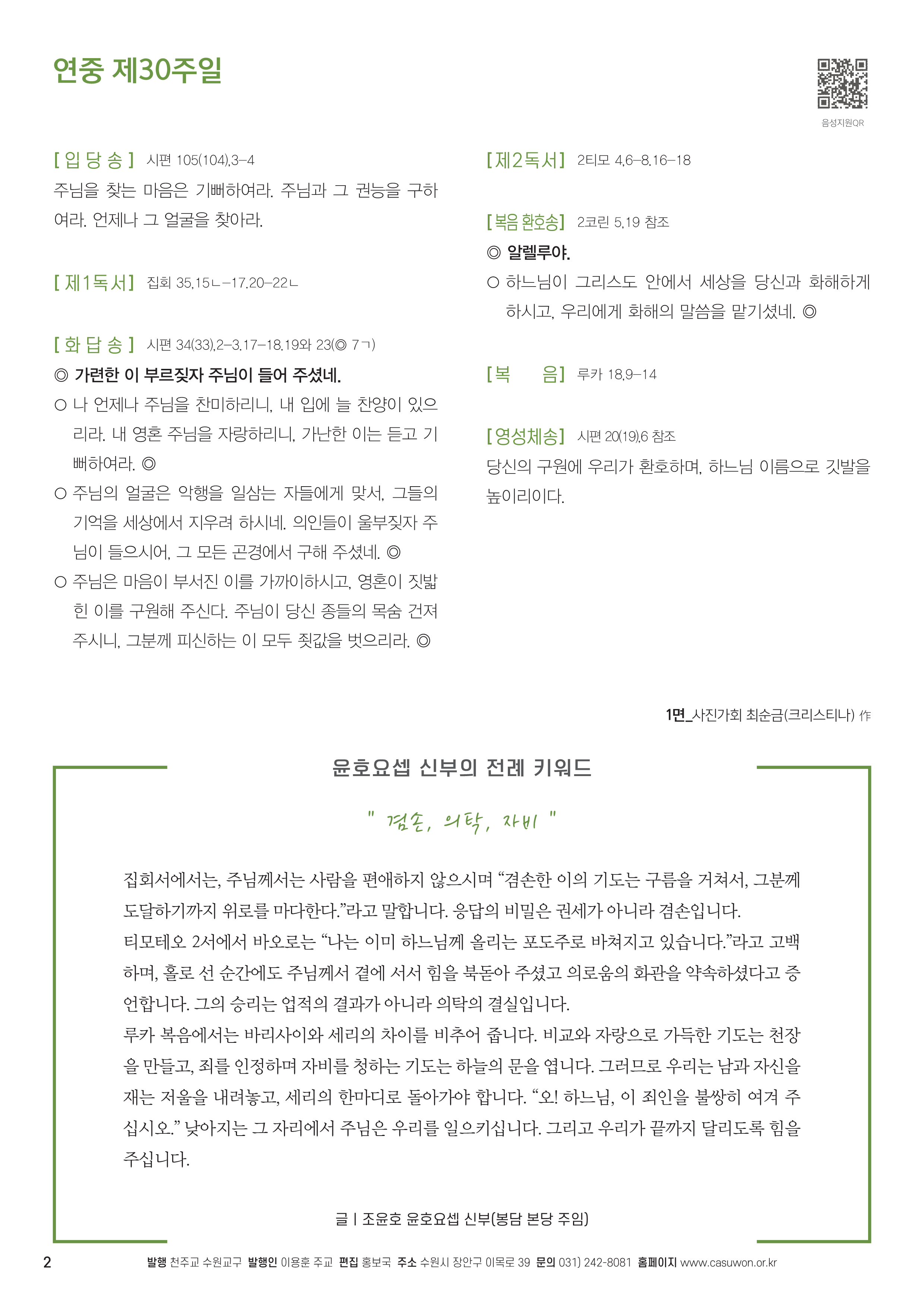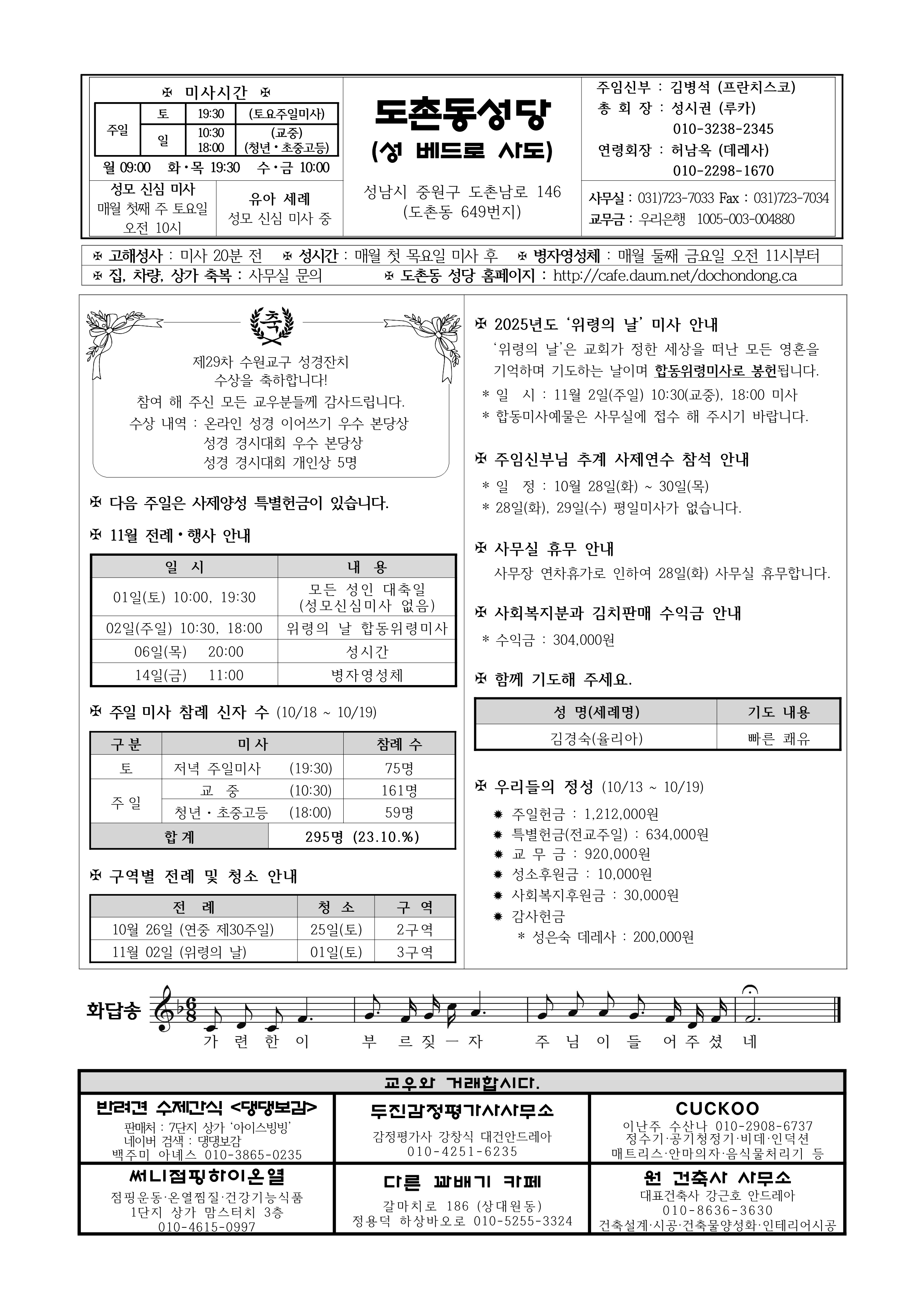 주보 - 연중 제30주일('25.10.26) 작성자조형준 에드몬드 사무장|작성시간25.10.24|조회수57 목록 댓글 0 글자크기 작게가 글자크기 크게가 다음검색 현재 게시글 추가 기능 열기 북마크 신고 센터로 신고 댓글 댓글 0 댓글쓰기 답글쓰기 댓글 리스트