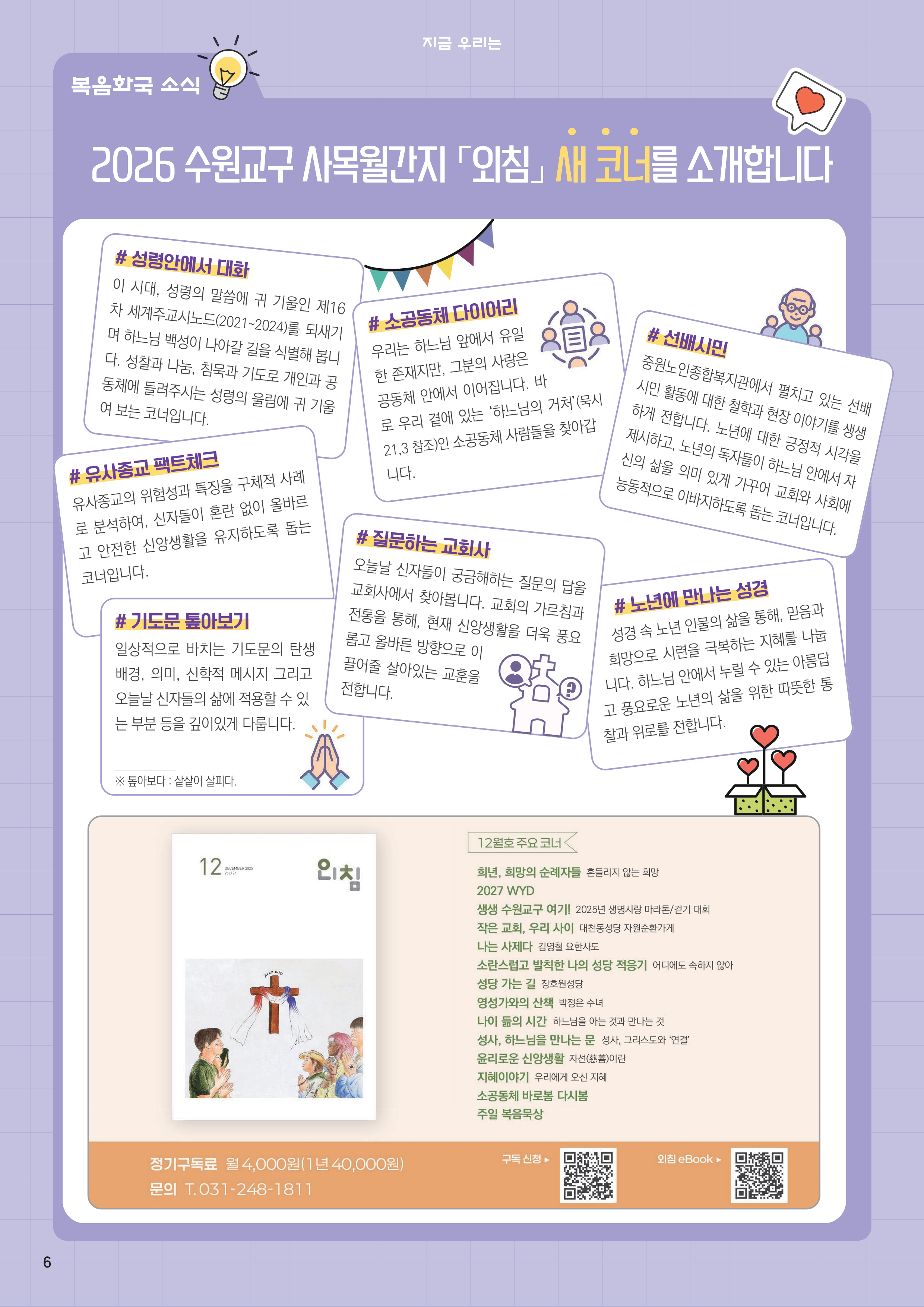 주보 - 대림 제2주일(인권 주일⦁사회 교리 주간)('25.12.07) 작성자조형준 에드몬드 사무장|작성시간25.12.05|조회수33 목록 댓글 0 글자크기 작게가 글자크기 크게가 . 다음검색 현재 게시글 추가 기능 열기 북마크 신고 센터로 신고 댓글 댓글 0 댓글쓰기 답글쓰기 댓글 리스트
