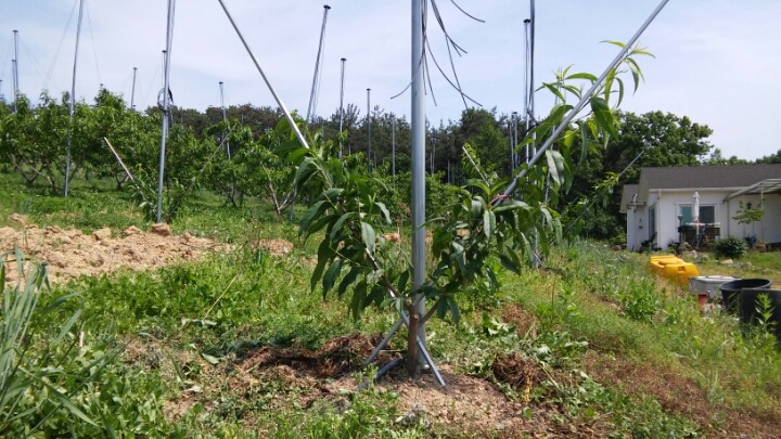 지금까지는 복궁아를 '자유분방형(?)으로 키웠는데 이번에는 '이본지주 개심자연형'으로 키우려고 유인작업을 했습니다.