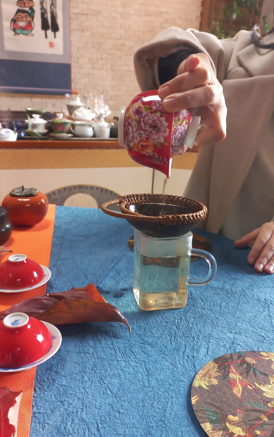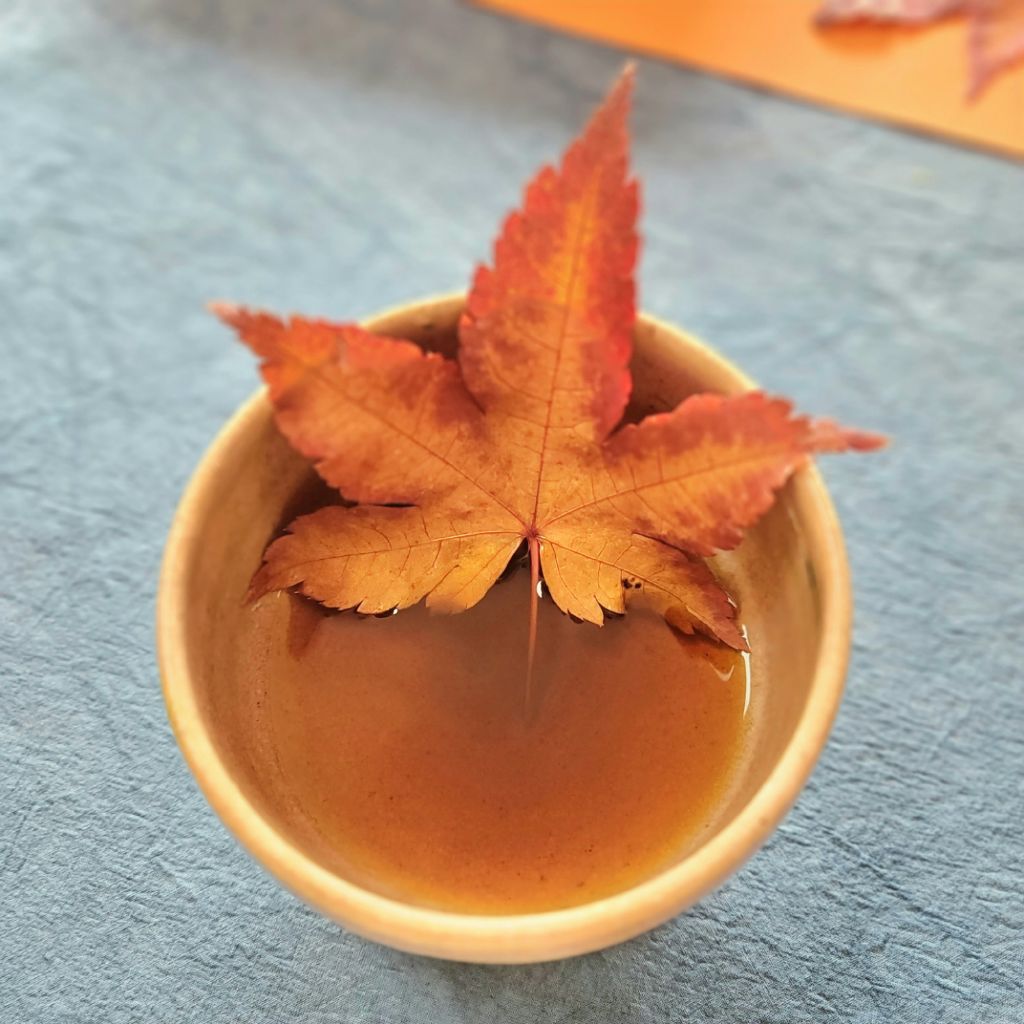 단풍잎에 물을 흘려 개완에 따르는 퍼포먼스는