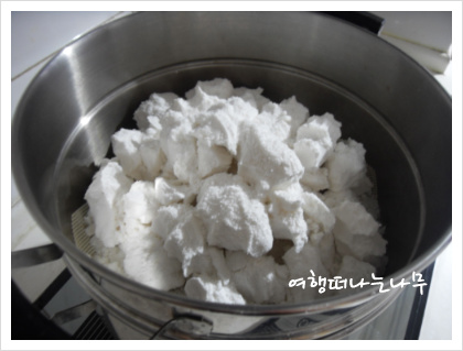 2. 김이 오른 찜통에 면보자기를 깔고 찹쌀가루를 손으로 쥐어 덩어리를 만든 후 20여분을 쪄준다.