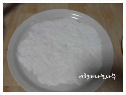 5. 전분가루를 쟁반에 고루 뿌려 놓고 만들기 시작....
