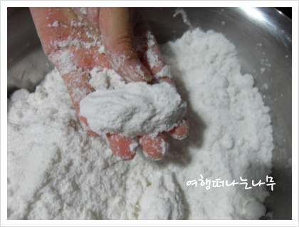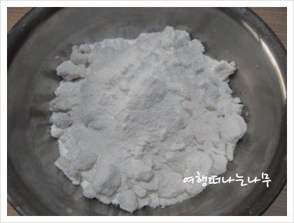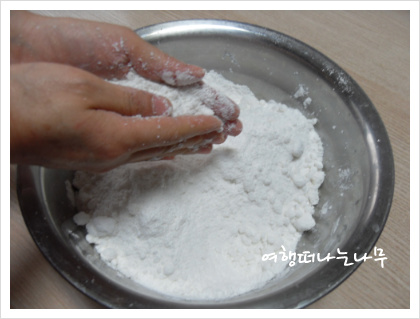 1. 찹쌀가루를 물, 설탕, 소금을 넣고 손으로 살살 비벼준 후 체에 내린다.