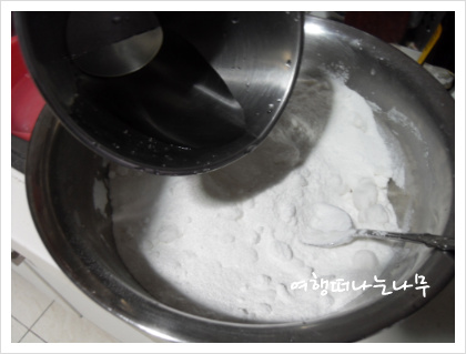 재료: 찹쌀가루 8컵, 물 8TS, 설탕 8TS. 소금약간, 팥앙금