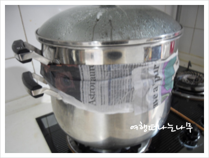 찜통의 김이 새지 않게 젖은 신문지로 이렇게 둘러주면 간단하게 O.K !