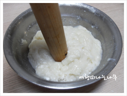 4.잘쪄진 가루를 꺼내어 방망이로 찧어주면 찰기가 생겨 더 쫀득거린다.