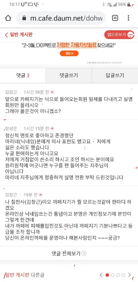 1)1월12일에 장성은 총무가 카페 닉네임 실명전환을 요구하는 글을 올렸었네요. 이마저도 없는 줄 알았습니다.