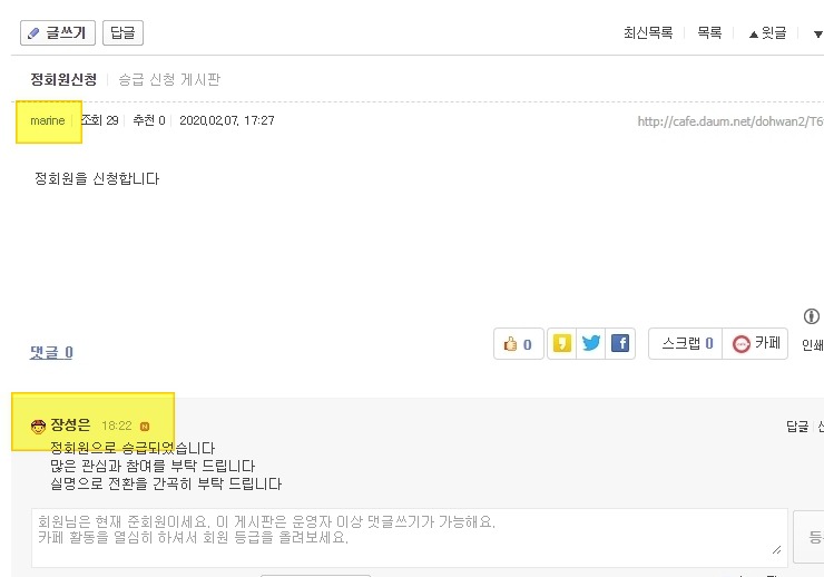 3) 그런데 아래와 같이 어떤 비실명 회원분이 정회원 신청하니 장성은 총무는 받아줍니다.
