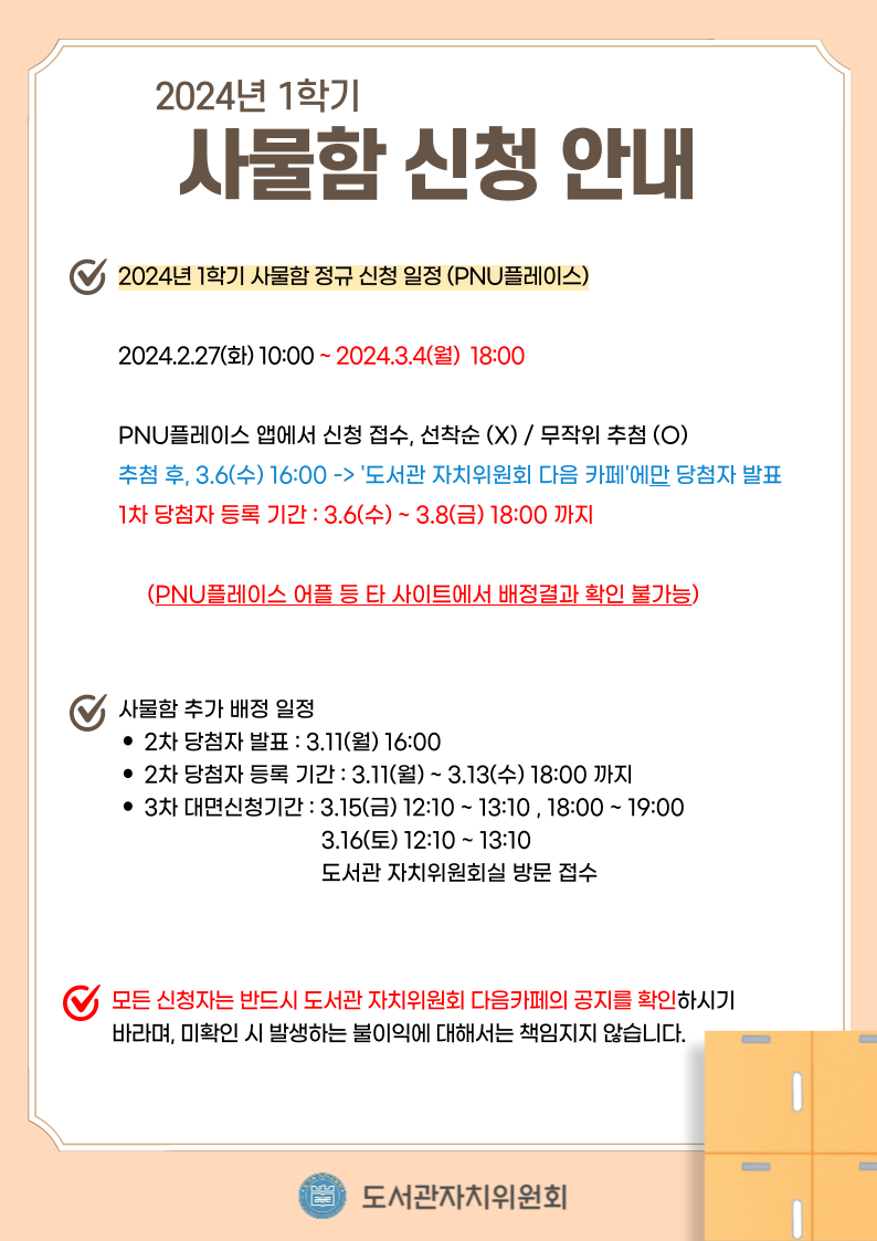 도서관의 무료사물함은 매 학기마다 ‘부산대학교 도서관 자치위원회’에서 신청을 받고 있습니다.