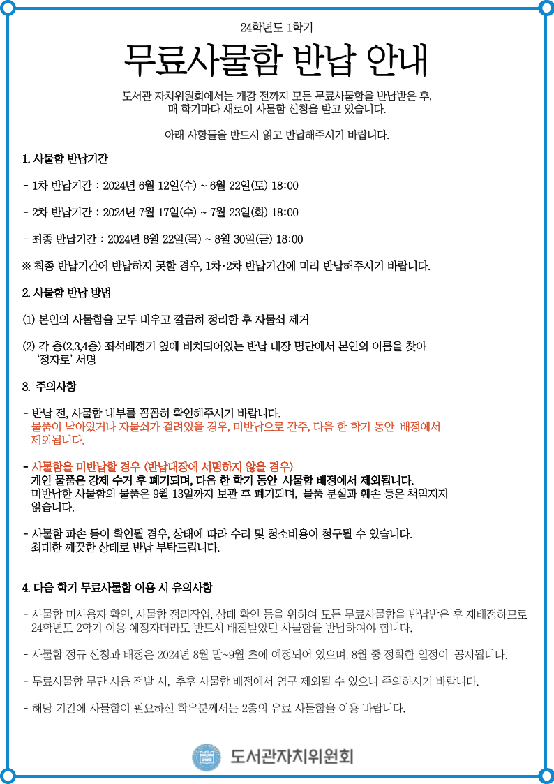 - 사물함 미사용자 확인 및 사물함 정리작업, 상태 확인 등을 위하여 모든 무료사물함을 반납받은 후 재배정하므로 24학년도 2학기 이용 예정자더라도 반드시 반납하여야 합니다.