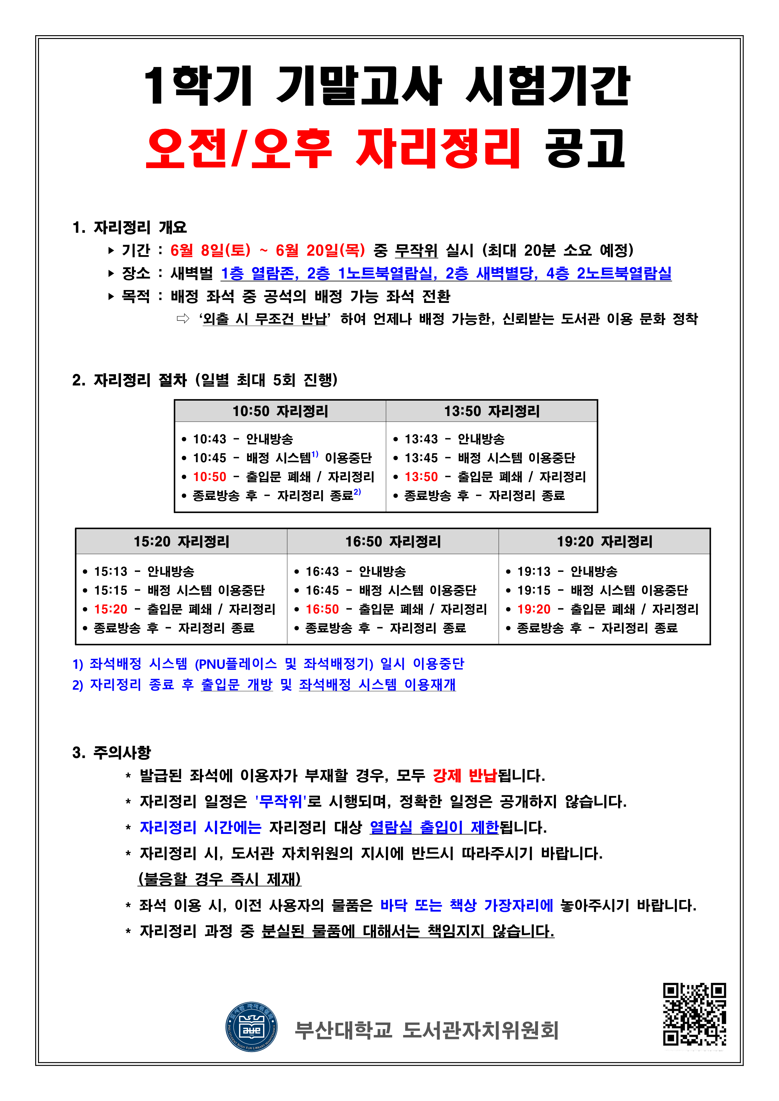 도서관자치위원회 자리정리의 본 목적은 단순 '좌석 취소'가 아닌, 시험 기간 중 '좌석 반납'을 생활화하여 '자리 사유화'를 근절하는 것입니다. 도서관은 많은 학우분들이 이용하는 공공 시설물이므로, 특히 시험기간 동안은 학우분들의 소중한 시간을 위해 적극 협조 부탁드립니다.