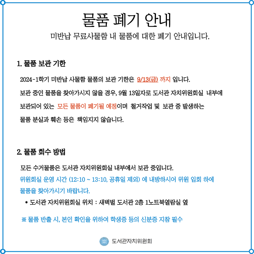 보관 중인 물품을 찾아가시지 않을 경우, 9월 13일자로 도서관자치위원회실 내부에 보관되어 있는 모든 물품이 폐기될 예정입니다.