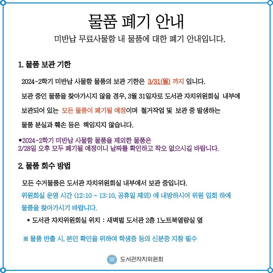 보관 중인 물품을 찾아가시지 않을 경우, 3월 31일자로 도서관자치위원회실 내부에 보관되어 있는 모든 물품이 폐기될 예정입니다.