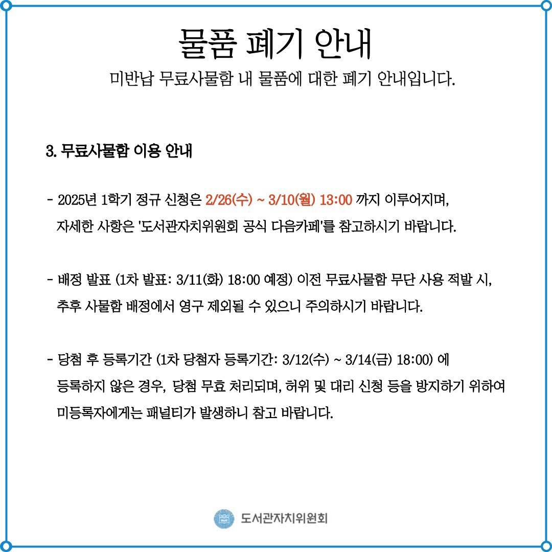 미반납 무료사물함 내 물품 폐기에 관한 안내입니다.