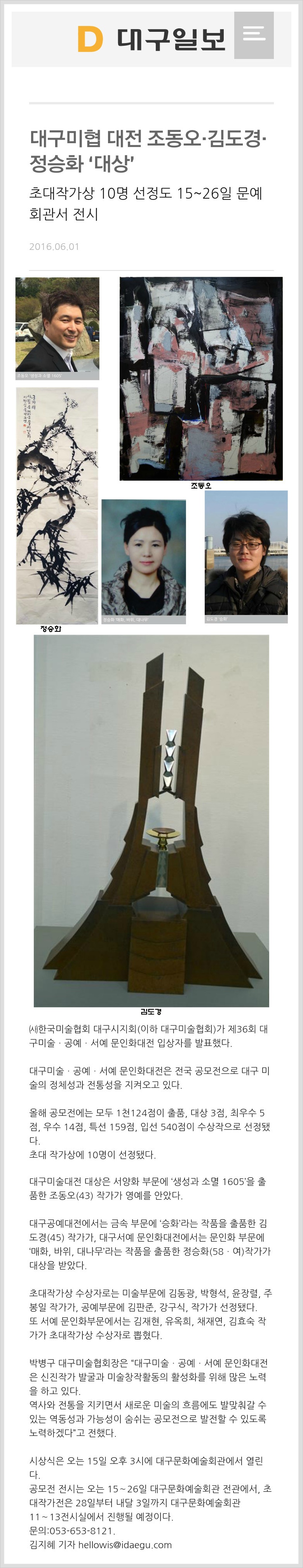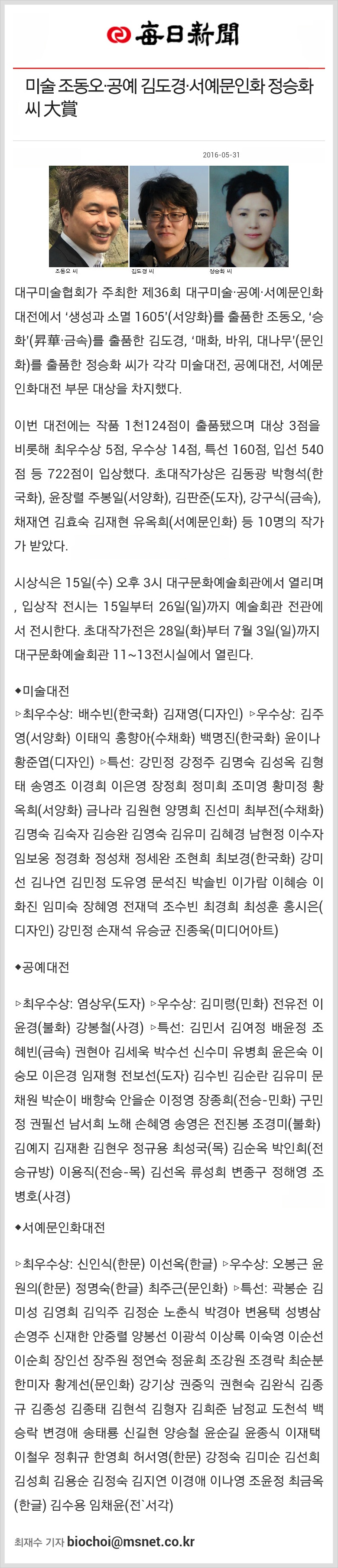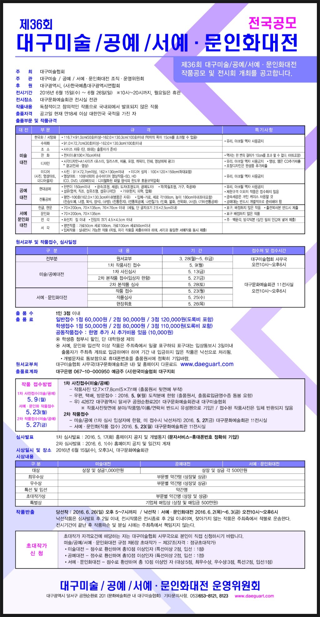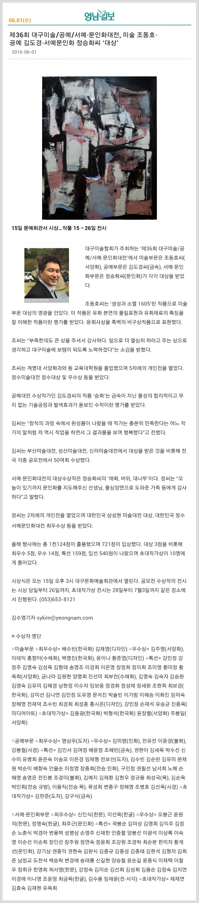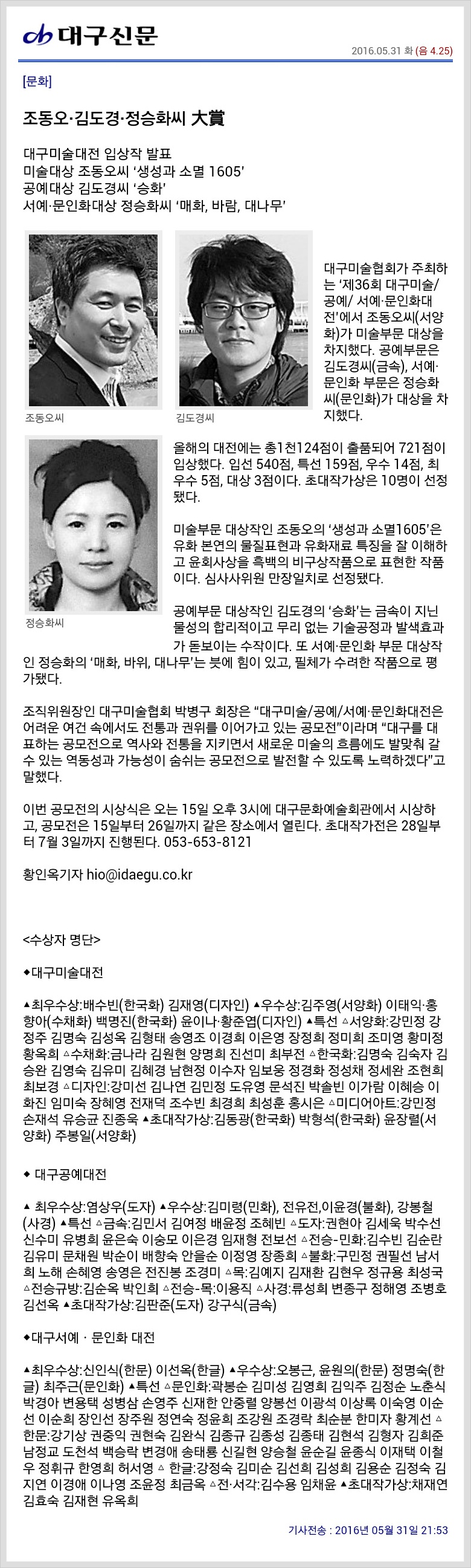제36회 대구미술/공예/서예․문인화대전 작품공모 및 전시회 개최 공고.발표 최종명단발표 ↓↓↓ <수상자 명단> 대구미술대전 ▼최우수상 배수빈(한국화) 김재영(디자인) ▼우수상 김주영(서양화) 이태익·홍향아(수채화) 백명진(한국화) 윤이나·황준엽(디자인) ▼특선 △ 한국화 △ 김명숙 김숙자 김승완 김영숙 김유미 김혜경 남현정 이수자 임보웅 정경화 정성채 정세완 조현희 최보경 △ 서양화 △ 강민정 강정주 김명숙 김성옥 김형태 송영조 이경희 이은영 장정희 정미희 조미영 황미정 황옥희 △ 수채화 △ 금나라 김원현 양명희 진선미 최부전 △ 디자인 △ 강미선 김나연 김민정 도유영 문석진 박솔빈 이가람 이혜승 이화진 임미숙 장혜영 전재덕 조수빈 최경희 최성훈 홍시은 △ 미디어아트 △ 강민정 손재석 유승균 진종욱 ▲ 초대작가상 ▲ 김동광(한국화) 박형석(한국화) 윤장렬(서양화) 주봉일(서양화) 대구공예대전 ▼최우수상: 염상우(도자) ▼우수상 김미령(민화), 전유전,이윤경(불화), 강봉철(사경) ▼특선 △ 금속 △ 김민서 김여정 배윤정 조혜빈 △ 도자 △ 권현아 김세욱 박수선 신수미 유병희 윤은숙 이숭모 이은경 임재형 전보선 △ 전승-민화 △ 김수빈 김순란 김유미 문채원 박순이 배향숙 안을순 이정영 장종희 △ 불화 △ 구민정 권필선 남서희 노해 손혜영 송영은 전진봉 조경미 △ 목 △ 김예지 김재환 김현우 정규용 최성국 △ 전승규방 △ 김순옥 박인희 △ 전승-목 △ 이용직 △ 사경 △ 류성희 변종구 정해영 조병호 김선옥 ▲ 초대작가상 ▲ 김판준(도자) 강구식(금속) 대구서예ㆍ문인화 대전 ▼최우수상 신인식(한문) 이선옥(한글) ▼우수상 오봉근, 윤원의(한문) 정명숙(한글) 최주근(문인화) ▼특선 △ 문인화 △ 곽봉순 김미성 김영희 김익주 김정순 노춘식 박경아 변용택 성병삼 손영주 신재한 안중렬 양봉선 이광석 이상록 이숙영 이순선 이순희 장인선 장주원 정연숙 정윤희 조강원 조경락 최순분 한미자 황계선 △ 한문 △ 강기상 권중익 권현숙 김완식 김종규 김종성 김종태 김현석 김형자 김희준 남정교 도천석 백승락 변경애 송태룡 신길현 양승철 윤순길 윤종식 이재택 이철우 정휘규 한영희 허서영 △ 한글 △ 강정숙 김미순 김선희 김성희 김용순 김정숙 김지연 이경애 이나영 조윤정 최금옥 △ 전·서각 △ 김수용 임채윤 ▲ 초대작가상 ▲ 채재연 김효숙 김재현 유옥희 ★제36회대구미술대전-1차 입상자명단★ 2차 작품접수 5월27일(금) 오전10:00~ 오후6:00까지 대구문화예술회관 11전시실 *1차 심사 입상자에한함, 미 접수시 낙선처리 ============================================== 서양화 분과 이름 명제 서양화 강민정 A graceful still life 서양화 강석태 자작-숲 서양화 강영희 세월 서양화 강정주 환희 서양화 권태진 희망 II 서양화 금덕희 결실 서양화 길도경 산수유 서양화 김규희 Silk Road 서양화 김명숙 인상(印象) 서양화 김명숙 山 서양화 김미정 빛 서양화 김선지 기다림 서양화 김성옥 꽃보다 아름다운 단풍 서양화 김세윤 composition 서양화 김수연 새찜 서양화 김수진 그자리 서양화 김예지 Instant of Illusion(순간의 환영) 서양화 김주영 담-코스모스 서양화 김형태 소통의 확산 서양화 민태희 Poison 서양화 박경제 Imagine 서양화 박덕규 정밀(靜謐) 서양화 박세옥 정 서양화 박정애 해경(海景) 서양화 박현숙 가을-빛을 노래하다 서양화 석은지 순수함 서양화 손지원 봄의 향연 서양화 송영조 안동 1980 서양화 신선미 IRIS-오월의 사랑 서양화 심현영 화려한 외출-Dream 서양화 이갑순 합창 서양화 이경희 재생(再生)을 기다리며 서양화 이교기 숲-오름 서양화 이미애 가야산 서양화 이선옥 Forever 서양화 이선주 야경 서양화 이아랑 Chupa 서양화 이은비 unique I 서양화 이은영 플라타너스의 추억 서양화 이인석 BEYOND TIME : 꿈꾸는 나무 서양화 이정숙 즐거운 시간 서양화 임수정 아라 서양화 장미자 장날 서양화 장정희 꿈꾸는 나무 서양화 장혜숙 화음 서양화 정미희 예다움 서양화 정정희 꿈의 도시 (4) 서양화 조동오 생성과 소멸 1605 서양화 조미영 이상을 쫓아 서양화 조선조 땅따먹기 서양화 최칠임 군자 서양화 황미정 소담하는 풍경 서양화 황승만 처녀비행 서양화 황옥희 Memory ============================================== 수채화 분과 이름 명제 수채화 김원현 독락당 수채화 고진희 가을의 시작 수채화 금나라 그대 마음에 2016-2 수채화 김원현 해바라기 수채화 김정애 드림-Dream 수채화 김정애 황혼 수채화 김태분 홀로서기 수채화 김태분 그리움 수채화 김해성 숲의 소리 수채화 김혜경 휴식 수채화 송희숙 나무의 꿈 수채화 안순자 유혹 수채화 안순자 남겨진 시간 수채화 안윤희 활짝 핀 인생 수채화 안현정 dream come true(자화상) 수채화 양명희 향수 수채화 이남분 잔치 수채화 이남분 햇살 수채화 이문자 설경 수채화 이문자 풍경 수채화 이정미 콩꽃 수채화 이태익 그대-머무는 곳 수채화 이해정 찰나(刹那)의 미소 수채화 정규주 희망 수채화 정은선 계곡1 수채화 진선미 가을 고운사 수채화 최부전 감나무 수채화 최석희 천년의 계곡 수채화 최주훈 어릴적 놀던 곳 수채화 홍향아 나의 노래 2016-6 수채화 황숙