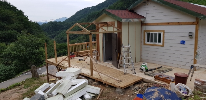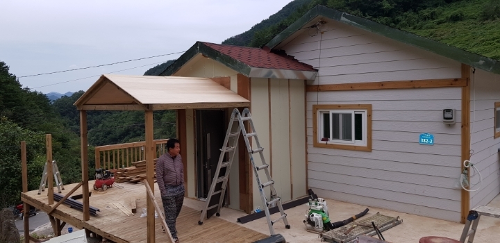 데크 바닥은 다 깔고 현관 앞에 눈비를 가릴 채양을 만들고 있어요.