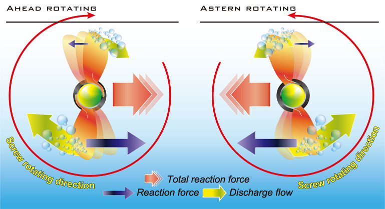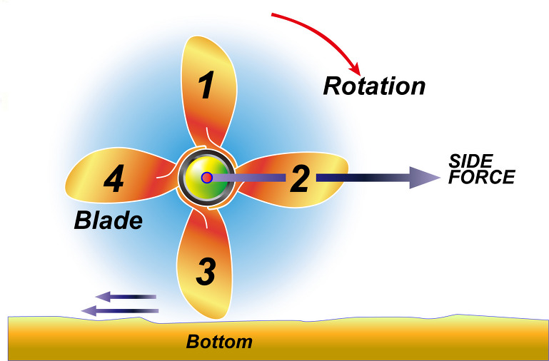 전진의 경우, 프로펠러 샤프트를 기준으로 Blade가 선회하면서 받는 수압은 상하가 다르다. 이러한 작용이 선미를 우회두하게 만들며 Midship상태에서 선수가 쉽게 좌회두하게 만드는 요인이다. 이것을 Sidewise Pressure(횡압력)이라고 한다. 후진의 경우는 이와 반대의 현상이 생긴다.